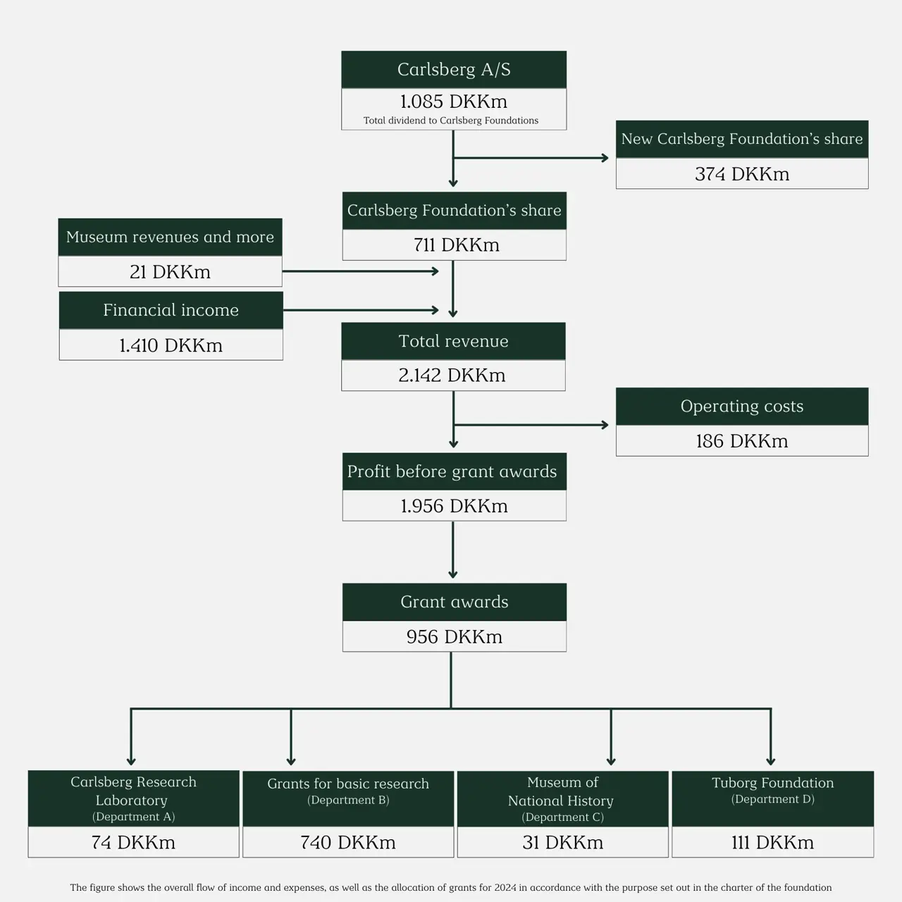 The total amount of the Carlsberg Foundation’s annual funding for grants depends on the dividends on the foundation’s shares in Carlsberg A/S. This is supplemented with revenue from other financial activities, which are affected by the global economy and its impact on the financial markets.