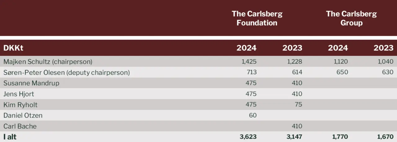 For 2024, the Royal Danish Academy of Sciences and Letters gave its approval for the Carlsberg Foundation’s ordinary board members to each receive an honorarium of DKKt 475 (basic honorarium), for the deputy chairperson to receive an honorarium of 1.5 times the basic honorarium and for the chairperson to receive an honorarium of 3 times the basis honorarium.