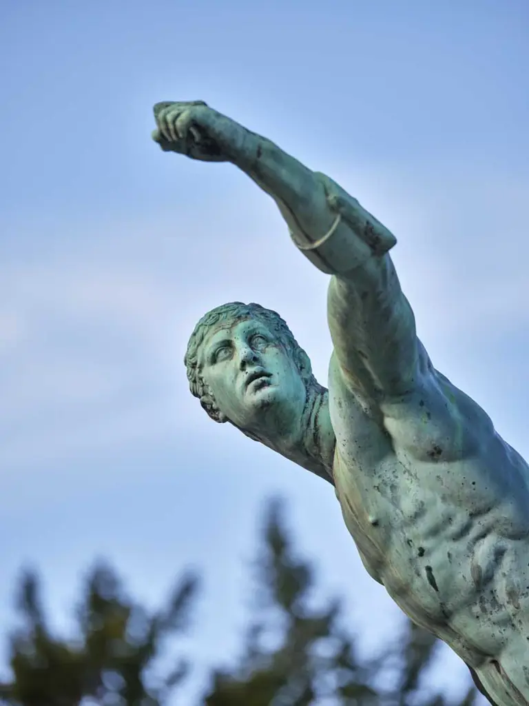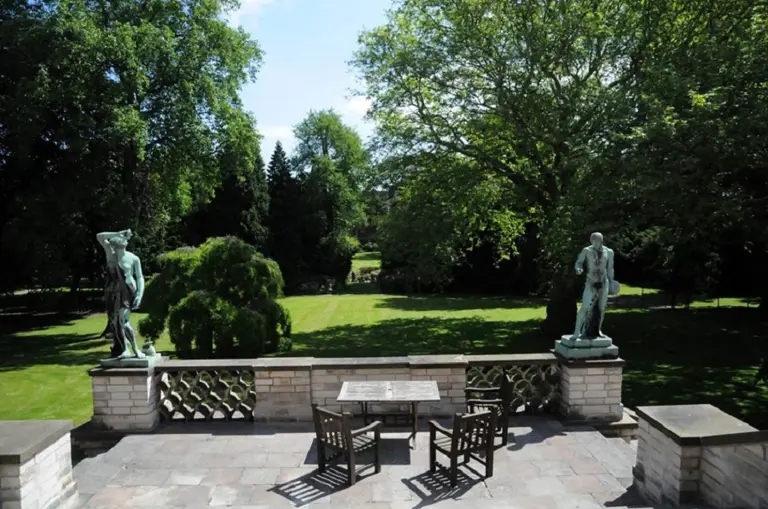 The main building was placed between the Carlsberg brewery and the garden on a sloping plot, so the approach to the house at that time was along an axis that began on Carlsbergvej and continued past the bronze sculpture The Borghese Gladiator down to the house and through the vestibule into the garden room, where three double French windows led out to the large garden staircase. On the terrace of the staircase there are bronze sculptures on each side ‒ The Discus Thrower and The Ephesian Amazon ‒ after which the axis branches off to either side. Niels Bohr, who lived in the honorary residence from 1931 to 1962, called the terrace “a hiding place for thoughts”.