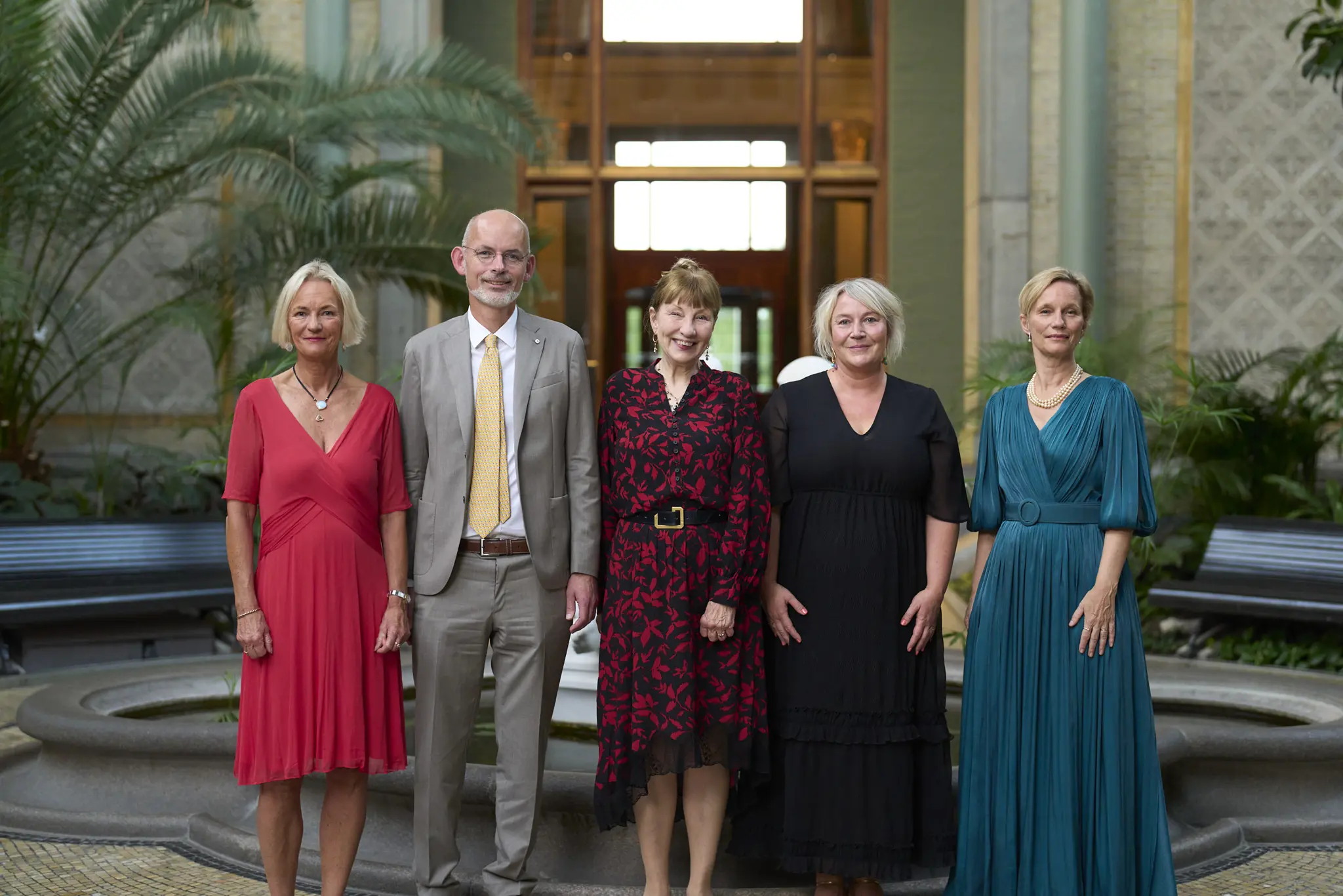 Overrækkelse af Carlsbergfondets Forskningspriser 2023. Fra venstre bestyrelsesforperson i Carlsbergfondet Majken Schultz, uddannelses- og forskningsminister Christina Egelund, prismodtagere Jens-Christian Svenning og Anne-Marie Mai og præsident i Videnskabernes Selskab Marie Louise Nosch