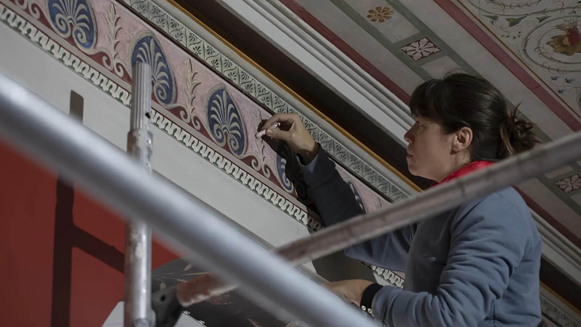 Under forundersøgelserne af akademiet dukkede interessante farvearkæologiske fund op såsom vægge med marmoreringer, døre med ådringer og skjulte skifervægge. I tæt dialog med restaureringsmalere, konservatorer og stukkatører genskabes vægdekorationer, stuklofter og døres egetræsådringer med traditionelle materialer og teknikker efter J.C. Jacobsens idéer med interiøret.