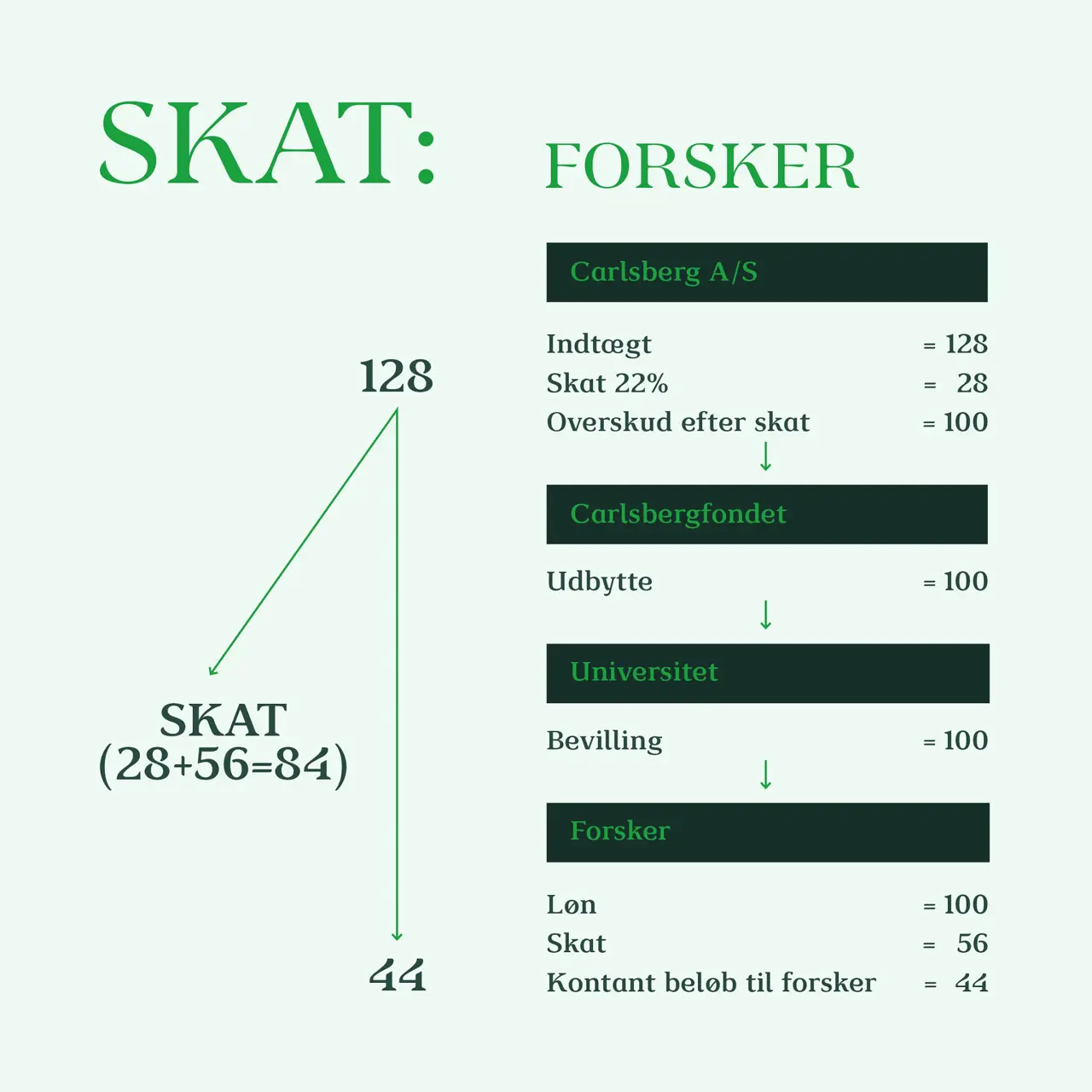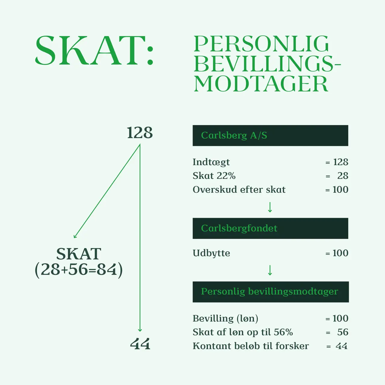 Den institution, som kan modtage bevillingen skattefrit, vil således ikke blive beskattet med indkomstskat, men hvis bevillingen udbetales videre til forskere, som er skattepligtige i Danmark, betales indkomstskat med op til ca. 56 procent. Der er således kontant 44 tilbage til personen efter skat af indtægten i Carlsberg A/S på 128.