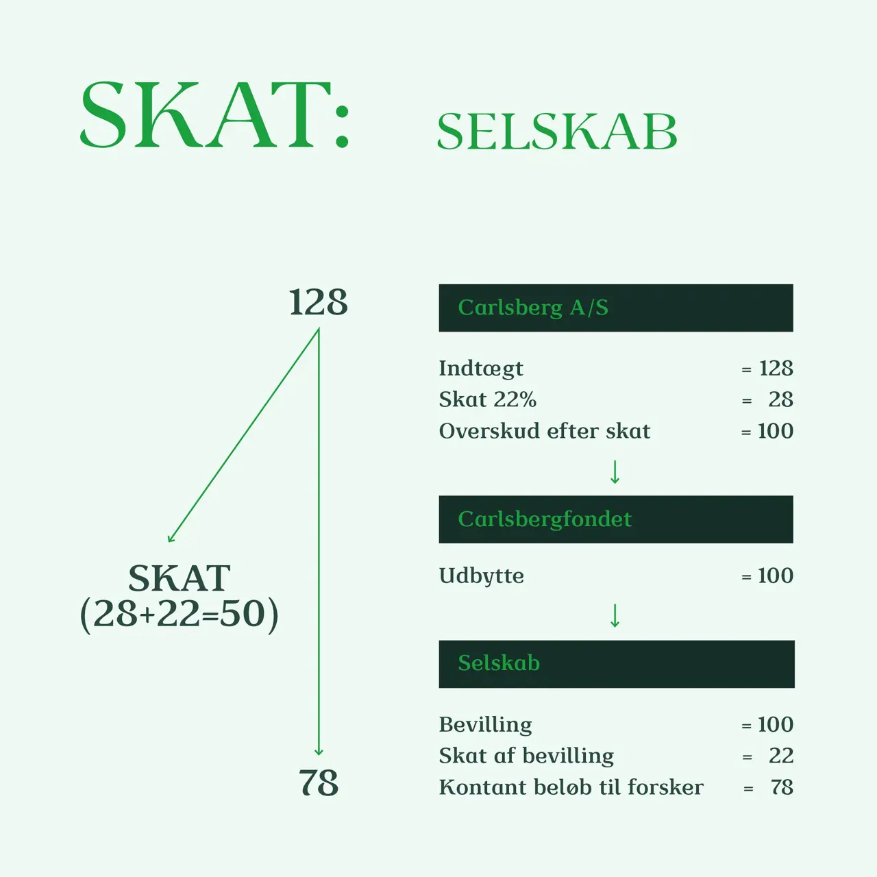 Carlsbergfondet modtager dermed 100, som for eksempel uddeles som bevilling til en forsker igennem et universitet. Som forklaret i oversigten nedenfor betaler fondet ikke særskilt skat, såfremt indtjeningen uddeles som almennyttige bevillinger.