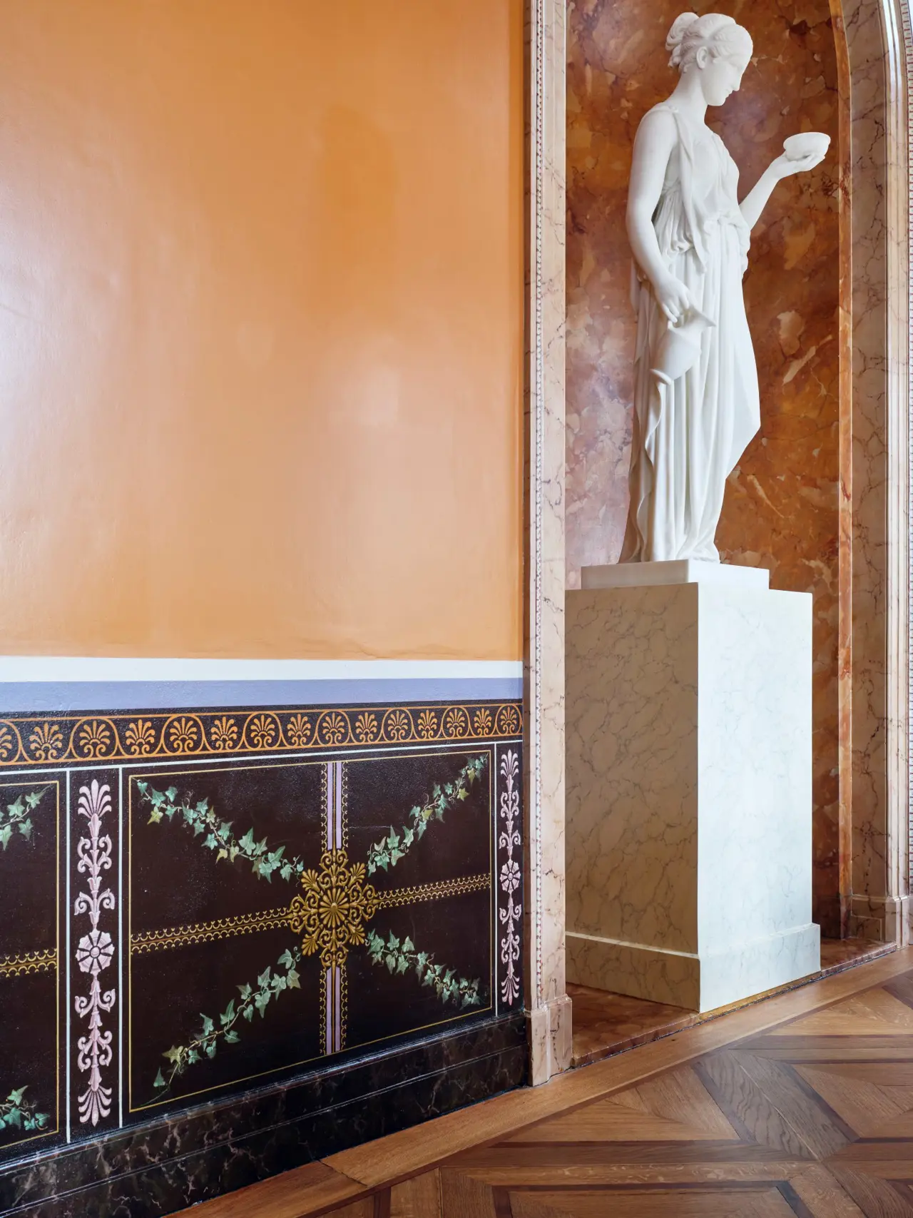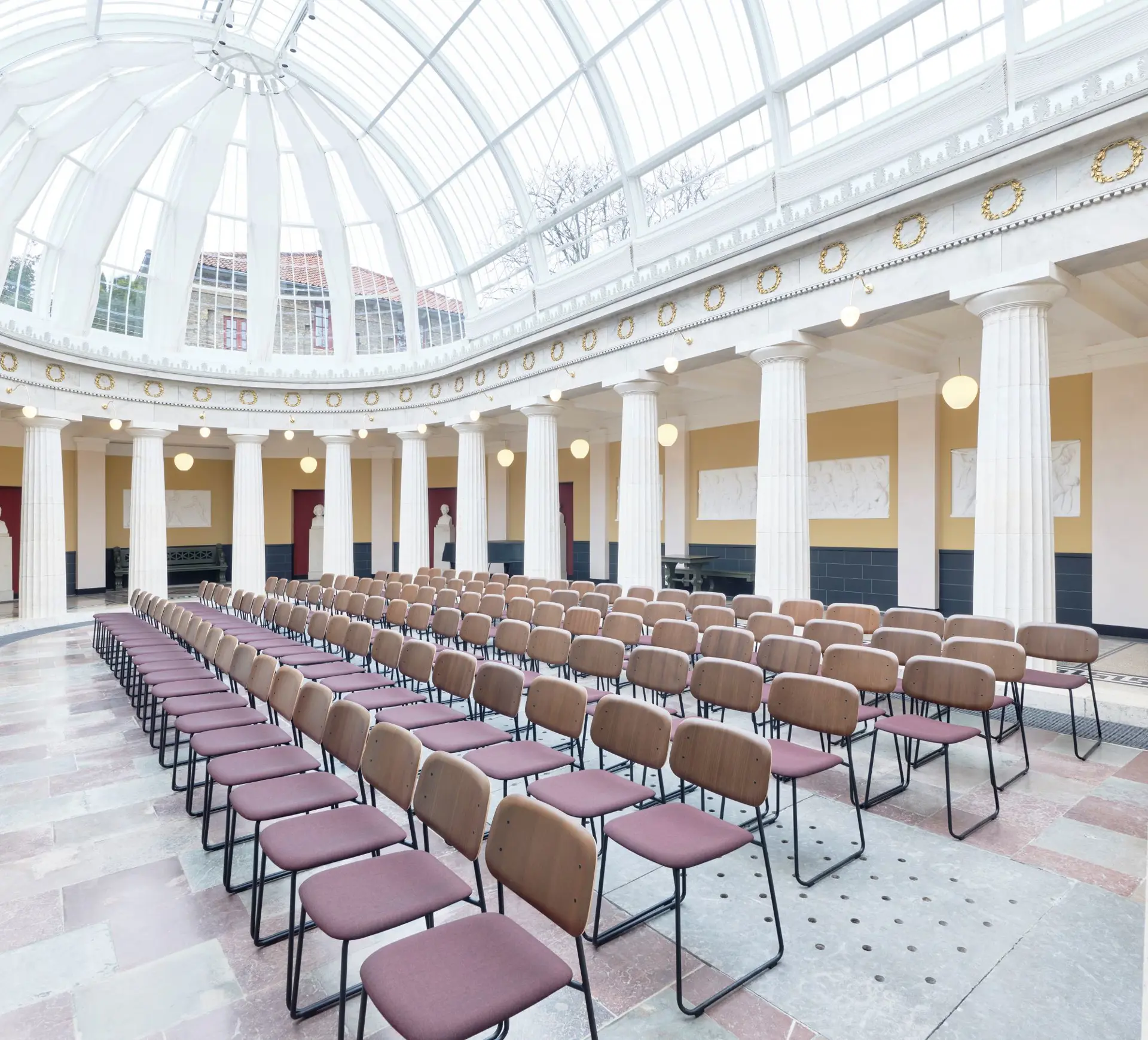 På østvæggen og i apsis i rummet er der opsat en række kopier af antikke buster side om side med buster af folk, der repræsenterede datidens kunst, videnskab og politik. Busterne var en slags ikoner for brygger Jacobsen. Her er digteren Homer, statsmanden Perikles og generalen Scipio sammen med kunstneren Bertel Thorvaldsen, videnskabsmanden H.C. Ørsted og politikeren L. N. Hvidt, hvilket illustrerer bryggerens mangfoldige interesser. Desuden er også bryggeren afbildet som buste. Busterne er udført af V. Bissen og Th. Stein. Bygningen er desuden forsynet med mosaikker med kopier af mønstre fra Pompeji.