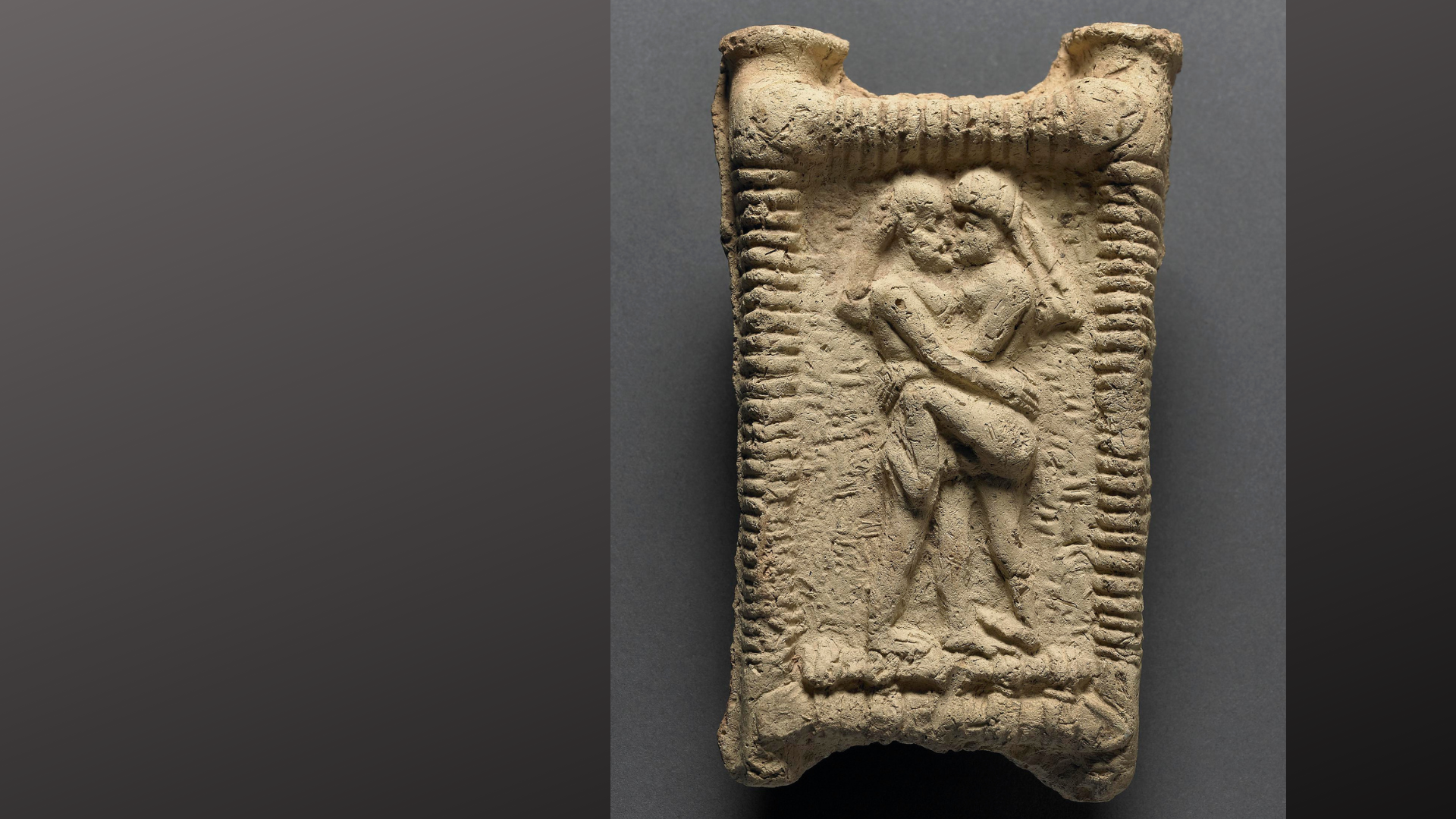 En lermodel fra Mesopotamien fra 1800 f.v.t. viser et par, der kysser. Originalen opbevares på The British Museum. Foto: The British Museum