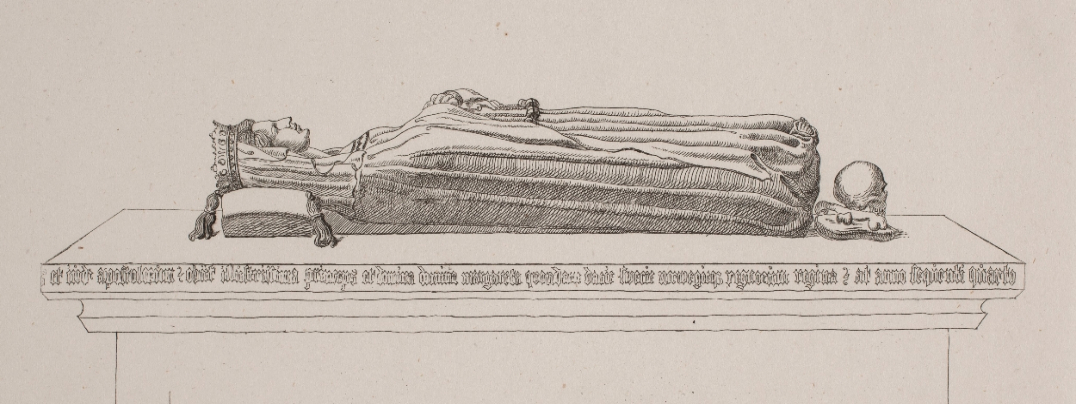 Radering af Dronning Margretes monument i Roskilde Domkirke. Udført af kunstner Jacob Kornerup (1825–1913) i 1851.