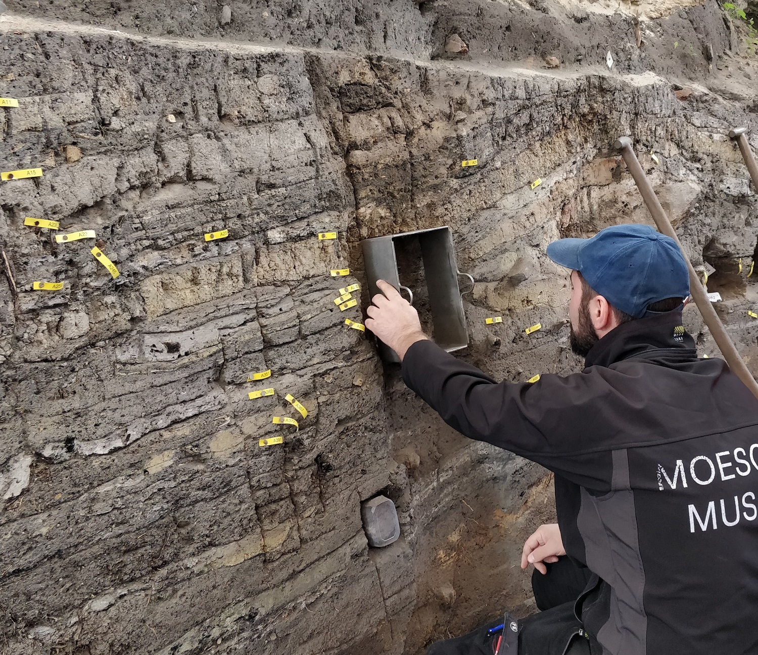 Vikingetidens emporium i Ribe har bevaret en yderst detaljeret stratigrafi af husgulve, værksteder og affaldsdepoter fra perioden ca. 700 – ca. 900 e.v.t. Dette har gjort det muligt for forskerne i Northern Emporium-projektet at kortlægge ankomsten af handelsvarer i den tid, hvor vikingetidens søhandel opstod. Lagene ved siden af arkæologens hånd i midten af billedet er, hvor Miyaki-begivenheden 775 CE kan spores ved kulstof-14 datering. Foto: Sydvestjyske Museer
