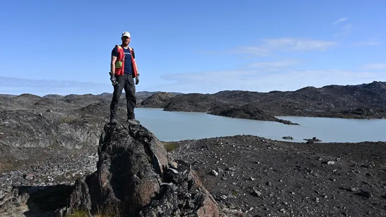 Lektor Kristoffer Szilas ved Isua. Ud fra forskningsresultaterne mener forskerne, at peridotitten ved Isua stammer fra de oprindelige magmakanaler, som lava strømmede ud gennem for mere end 3,7 milliarder år siden. Foto: Tomoaki Morishita