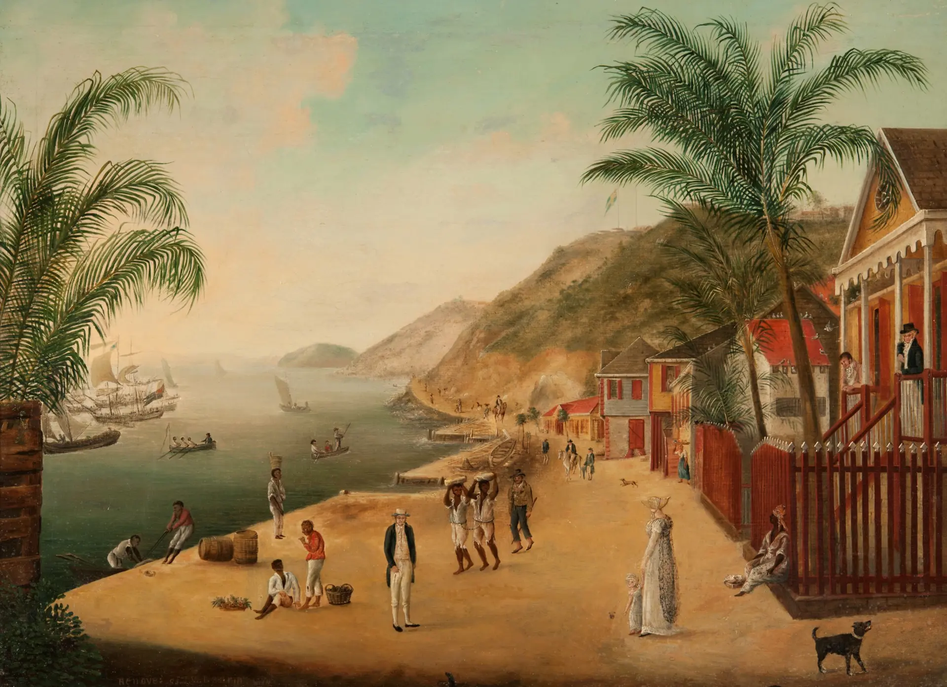 Havnefront i St. Barthélemy først i 1800-tallet. Fra Sjöhistoriska-museet.