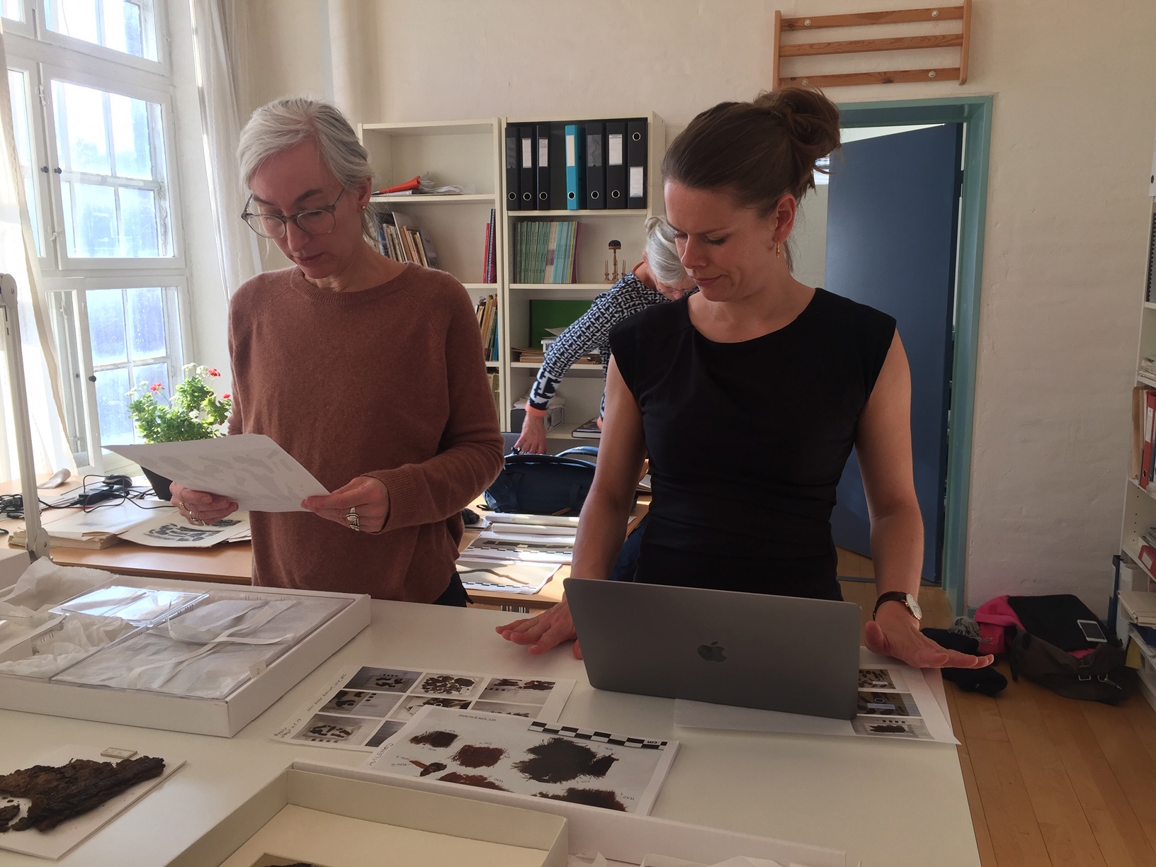 Luise Ørsted Brandt (th) udvælger pelsprøver sammen med tekstilforsker på Nationalmuseet Ulla Mannering, der er medforfatter på studiet. Foto: Charlotte Rimstad