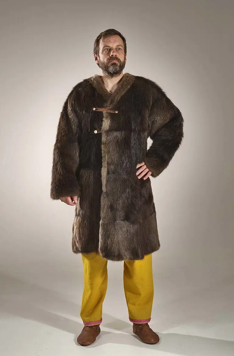 En rekonstruktion af beklædning til mænd fra vikingetiden i form af en særegen frakke af bæverpels. Foto: Roberta Fortuna