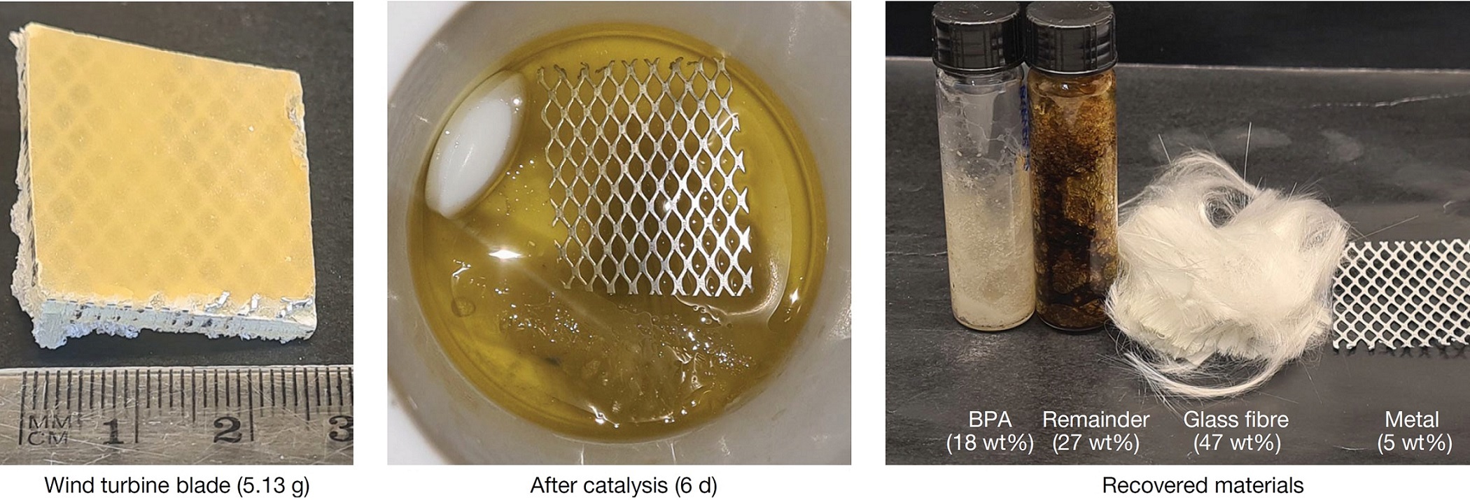 Konkret er det lykkedes forskerne at nedbryde de ellers meget svært nedbrydelige epoxy-kompositter, som vingerne består af. Med metallet ruthenium som katalysator i et bad af opløsningsmidlet toluen kunne de i én proces adskille epoxymatrixen og frigøre en af epoxypolymerens originale byggesten, bisphenol A (BPA), samt fuldt intakte glasfibre. Efter seks dage i katalyse var et stykke vindmøllevinge således opløst i intakte glasfibre og bisphenol A.