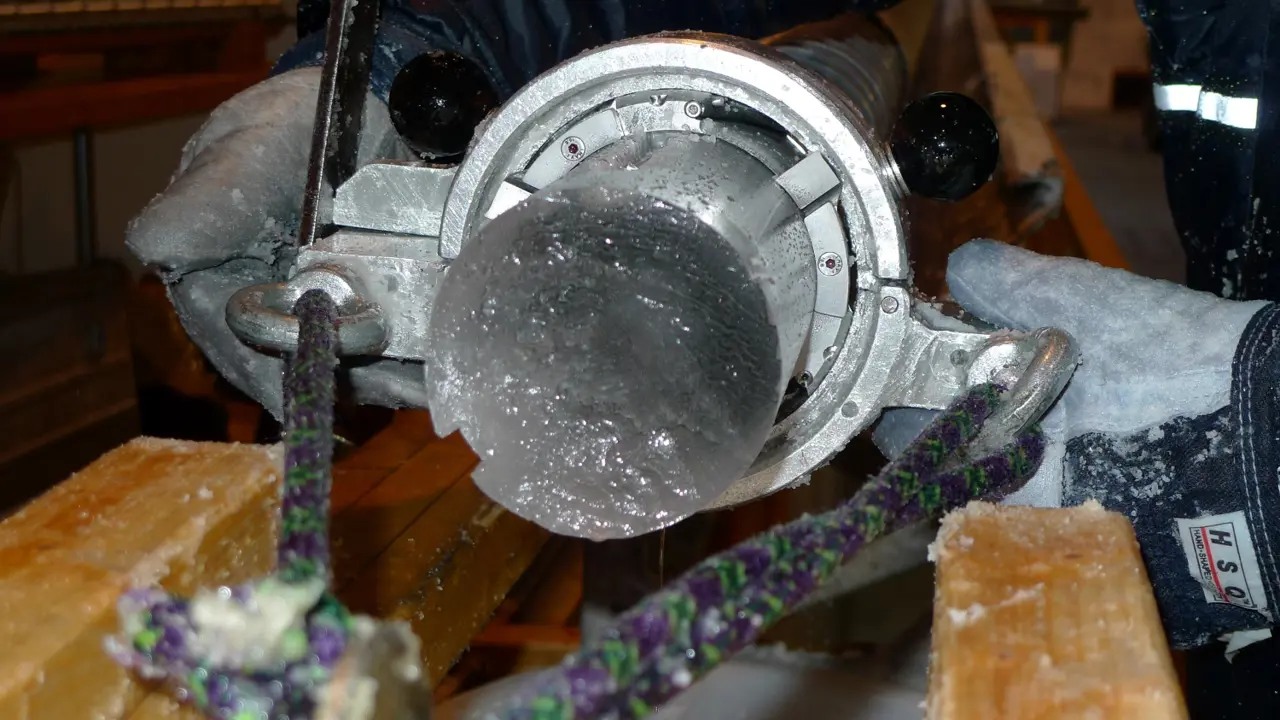 Dansgaard-Oeschger-begivenhederne er opkaldt efter den danske forsker Willi Dansgaard, som i 1950’erne fik den idé, at isotopanalyse af iskerner kan bruges til at undersøge fortidens klima. Også hans schweiziske kollega Hans Oeschger har lagt navn til de bratte klimaudsving i Grønland under seneste istid. Uden iskernerne ville vi i dag ikke have den samme viden om fortidens klimaskift eller eller tal på, hvordan atmosfæren var sammensat, før industrialiseringen begyndte for mere end 100 år siden. Foto: Isen skubbes forsigtigt ud. Af Sepp Kipfstuhl