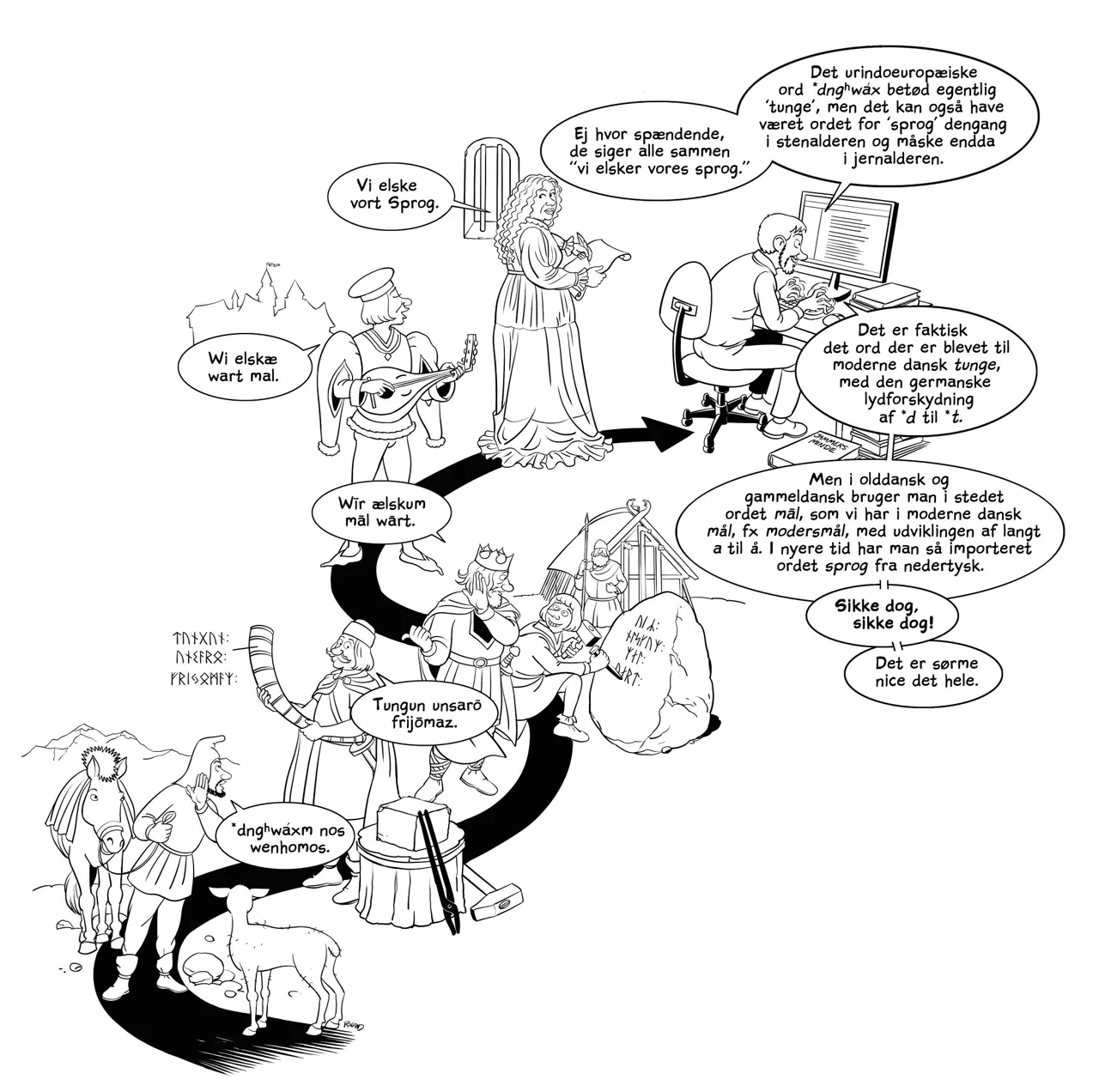 “Sproget ændres lidt ad gangen. Man kan for eksempel høre, at der ofte er en forskel på den måde, vi selv taler dansk på, og så vores bedsteforældres dansk, men det kan være svært at sige præcis, hvad forskellen er. Men hopper vi 1000 år tilbage til Jellingstenen skabt i vikingetiden, så er der en kæmpe forskel. Og endnu længere tilbage: Hvis man antager, at Egtvedpigen, der døde i 1370 før vor tidsregning - i bronzealderen - talte en form for dansk, jamen så ville det være lige så forskelligt fra nutidens dansk, som italiensk er det i dag,” forklarer han.