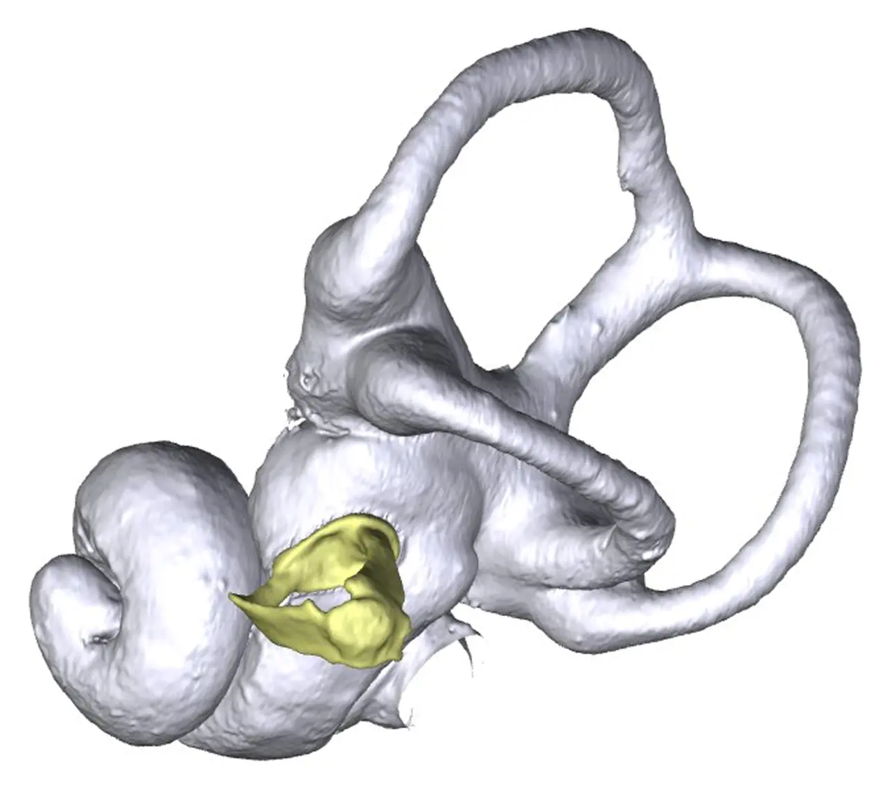 Forskerne har kortlagt pindsvinets øreanatomi ved hjælp af højopløselige mikro-CT-scanninger, der afslørede små, tætte mellemøreknogler, en let stigbøjle og en kompakt snegl. Model: Henrik Lauridsen