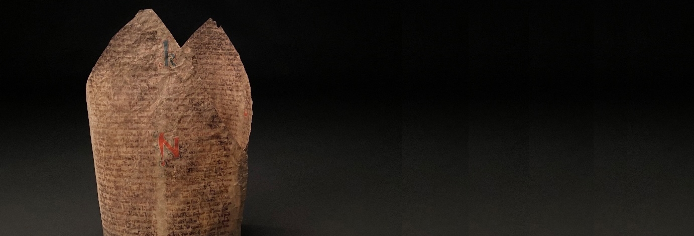 Norsk 1200-talshåndskrift med franske historier om høvisk kærlighed, som blev brugt som afstivning i en islandsk bispehue fra 1500-tallet. Fundet på Island i starten af 1700-tallet. København, Den Arnamagnæanske Samling, AM 666b 4to. Foto: Suzanne Reitz